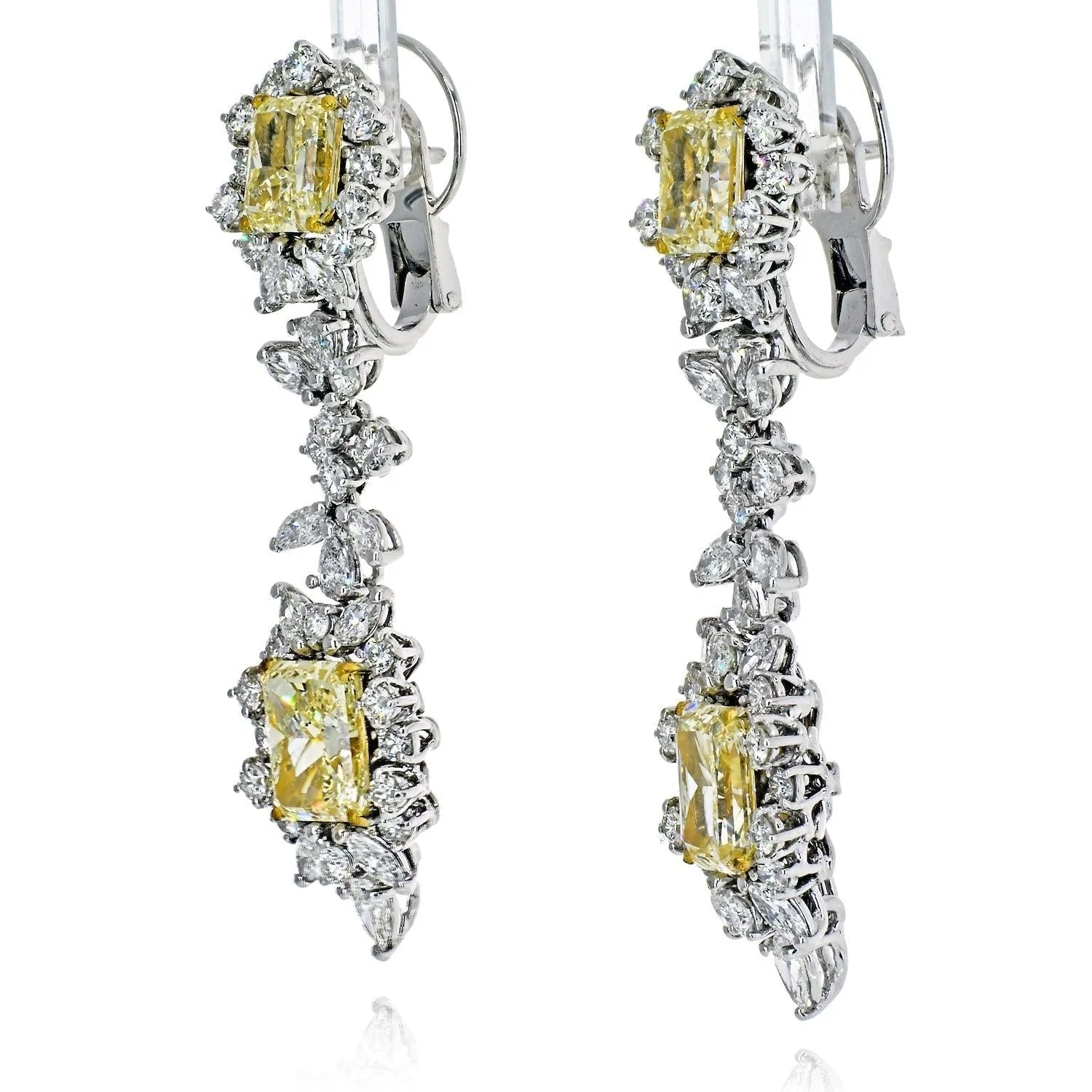 Exceptional Yellow and White Diamond Earrings centering four Radiant-Cut Yellow Diamonds of VVS1/VVS2 clarity totaling 10.75 Carats, framed by an additional 7.68 Carats of Marquis Cut, Pear Shape, and Round-Brilliant Cut Diamonds, and set in 25.1 grams of lush 18K White Gold.