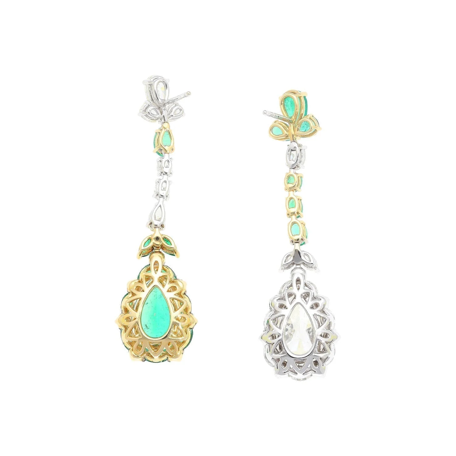 18 karat two-tone solid gold mounts these one-of-a-kind mirrored opposites emerald and diamond drop earrings. Featuring a natural 2.93-carat pear cut Colombian emerald and 3.01 carat natural pear cut diamond center stone on each earring.