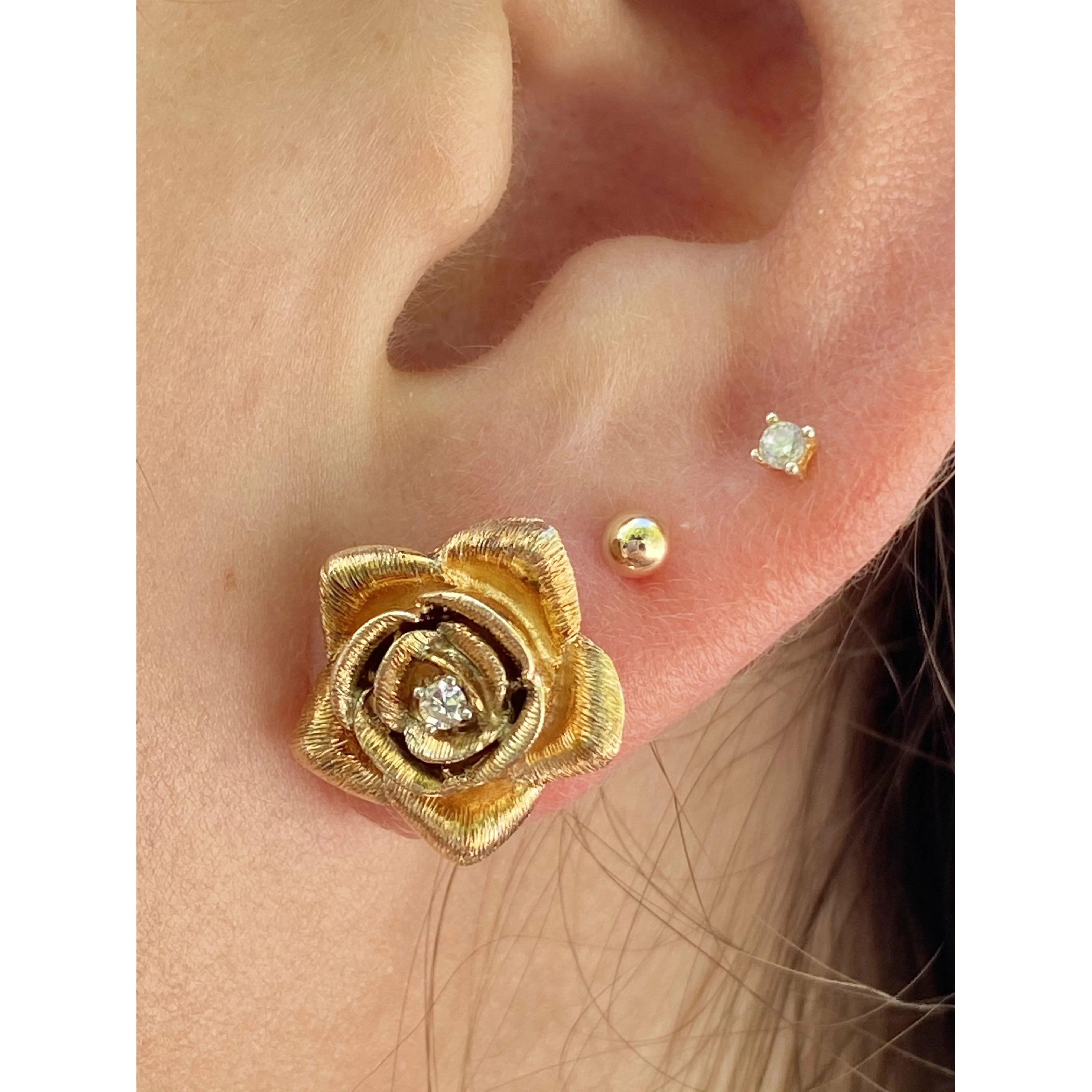Cute and dainty 14k solid gold flower design with a natural diamond set in the center. These earrings are set in 14k gold push back closure and a brushed, texture gold finish.