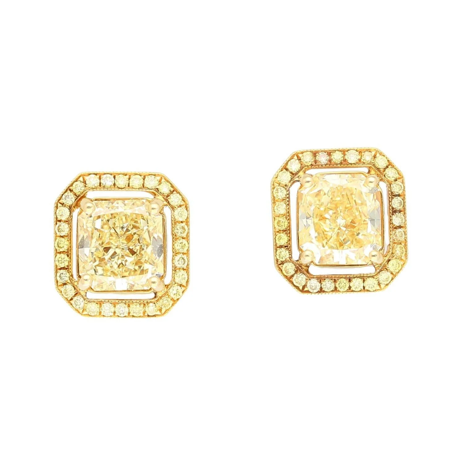 3 carat total weight fancy light yellow diamond stud earrings in 18k gold. Centering two radiant cut natural diamonds, each of which is GIA certified. The center stones feature a mesmerizing 1.50 carat internally flawless (IF) clarity and 1.42 carat VS1 clarity pair of diamonds. Both are adorned with a round cut yellow diamond halo of 0.27 carats. Mounted in the shiniest 18k yellow gold with a polished finish. These natural diamond stud earrings are a yellow masterpiece of fine jewelry.