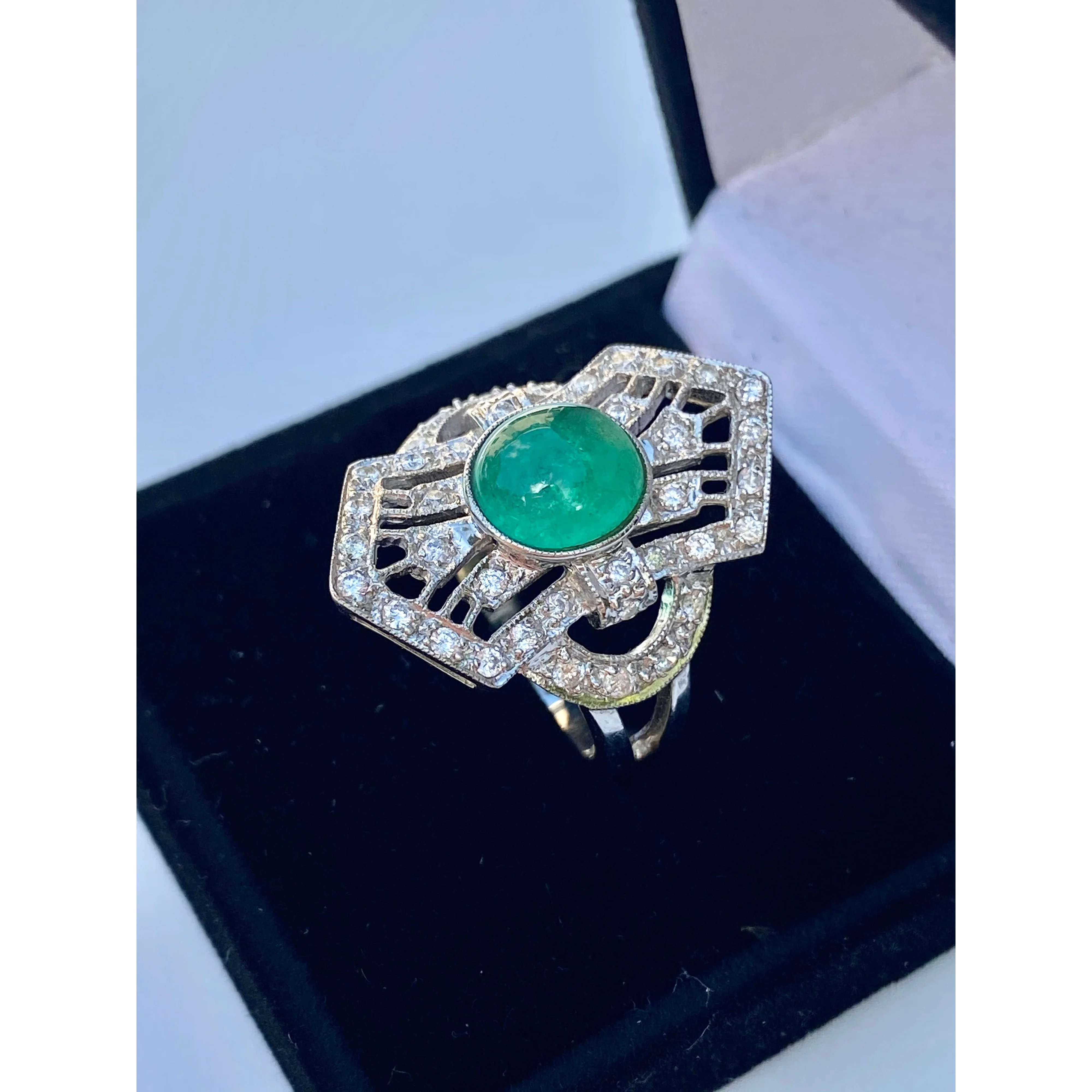 Cabochon Cut Natural Emerald Ring in Art Deco inspired Vintage White Gold Setting