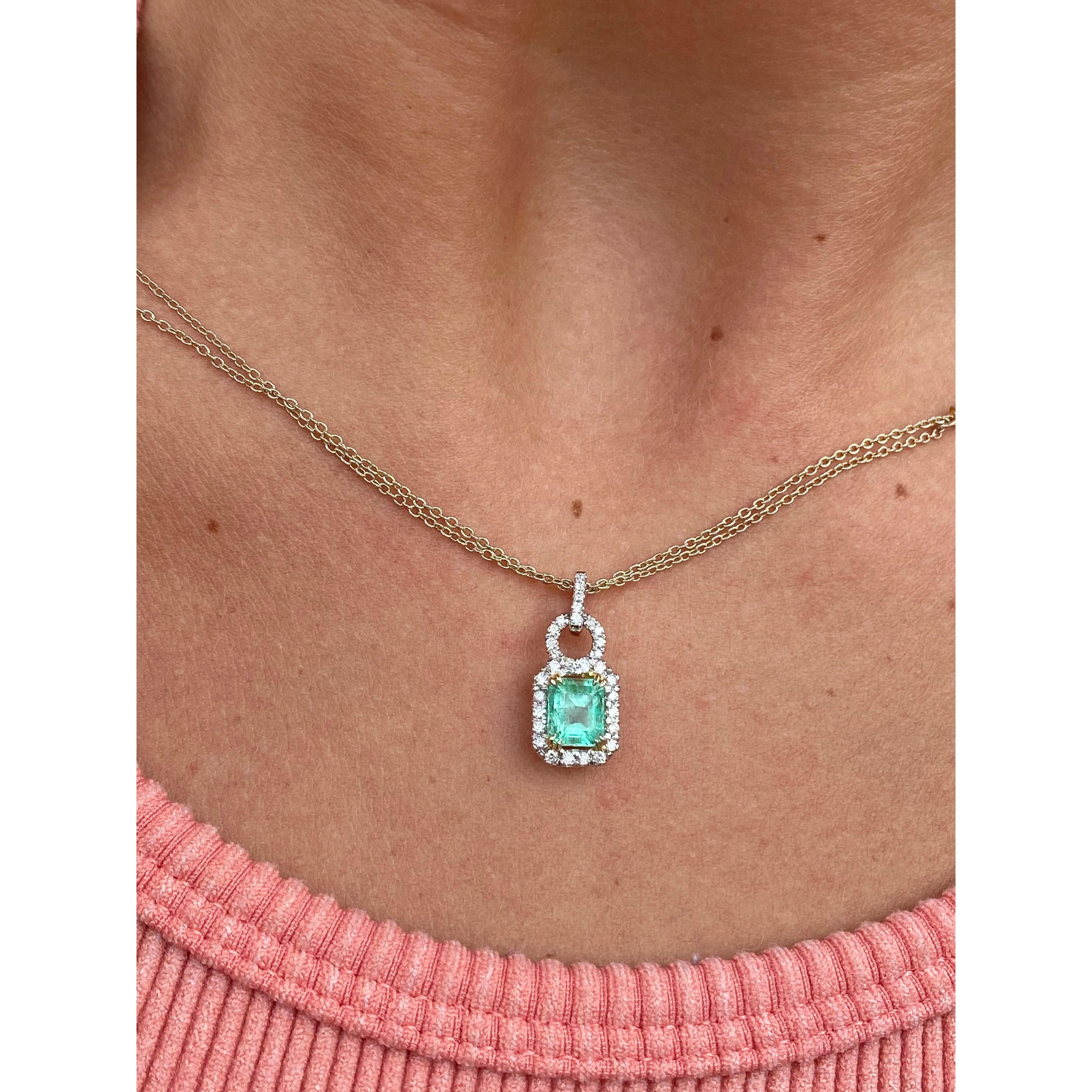 Natural Emerald Pendant and Diamond Halo in 18k Solid White Gold