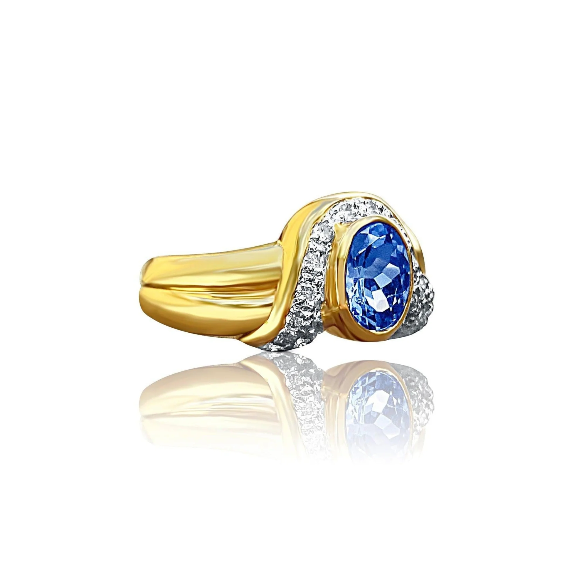 A true masterpiece of craftsmanship and premium raw materials. This ring can be used as an alternative engagement ring, pinky ring, or statement piece. The center stone is top quality AAA grade Tanzanite, a perfect mix of color hue between blue and violet, the ideal color saturation for Tanzanite gemstones. Center stone is also oval brilliant cut for optimal sparkle and shine. All adorned with 0.22 carats of natural diamonds and mounted in thick 14k yellow and white gold setting.