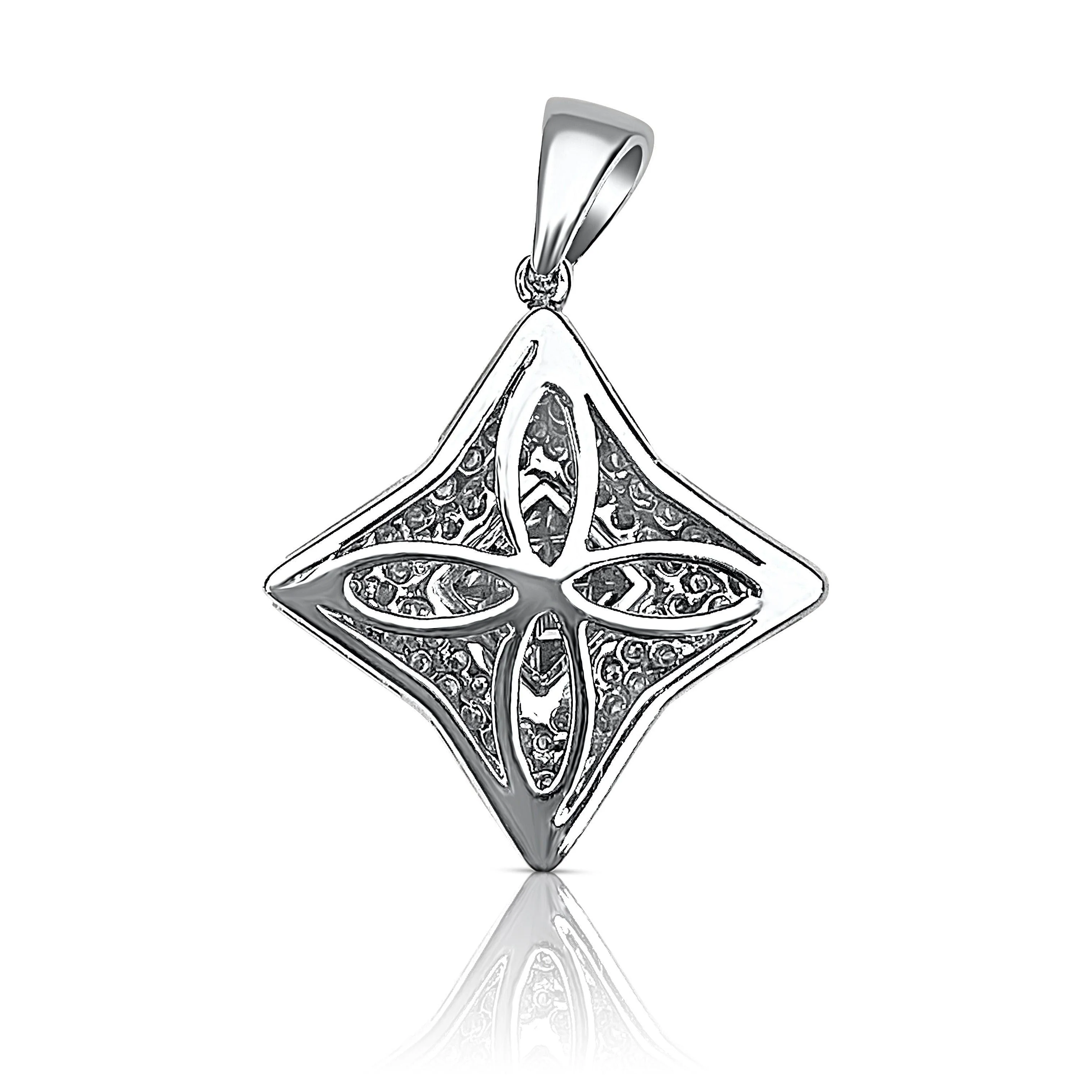 Star shape pendant with VS2 natural micro-set diamonds mounted in 18k solid white gold. Diamond weight (0.80 carats) is divided into 0.50 carats of princess cut center stones and 0.30 carats of adorning micro-pave diamonds.