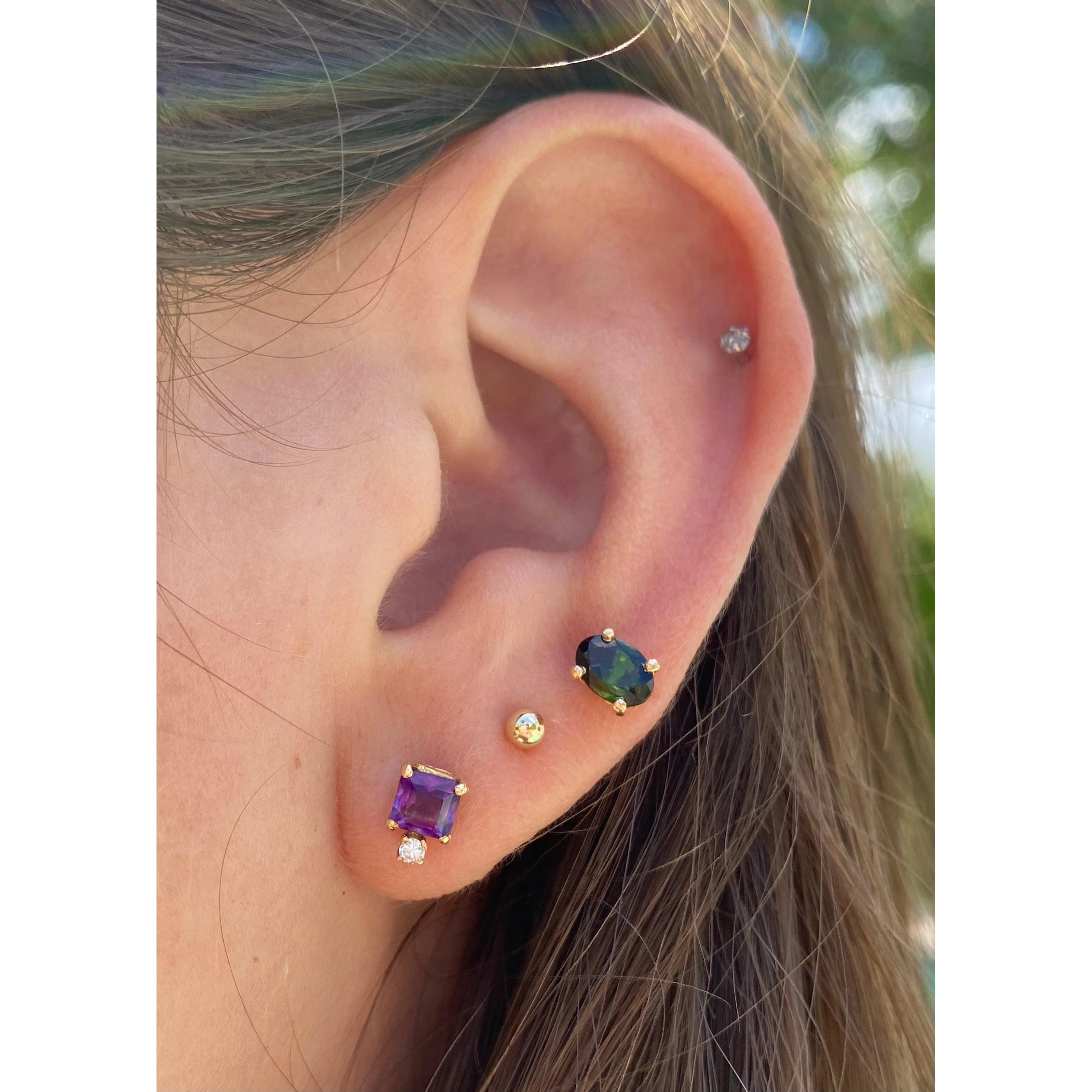 Cute and dainty natural Amethyst and Diamond stud earrings set in 14k solid gold push back closure with 4 prong setting. Small enough for Earlobe, Tragus, or Cartilage placement.